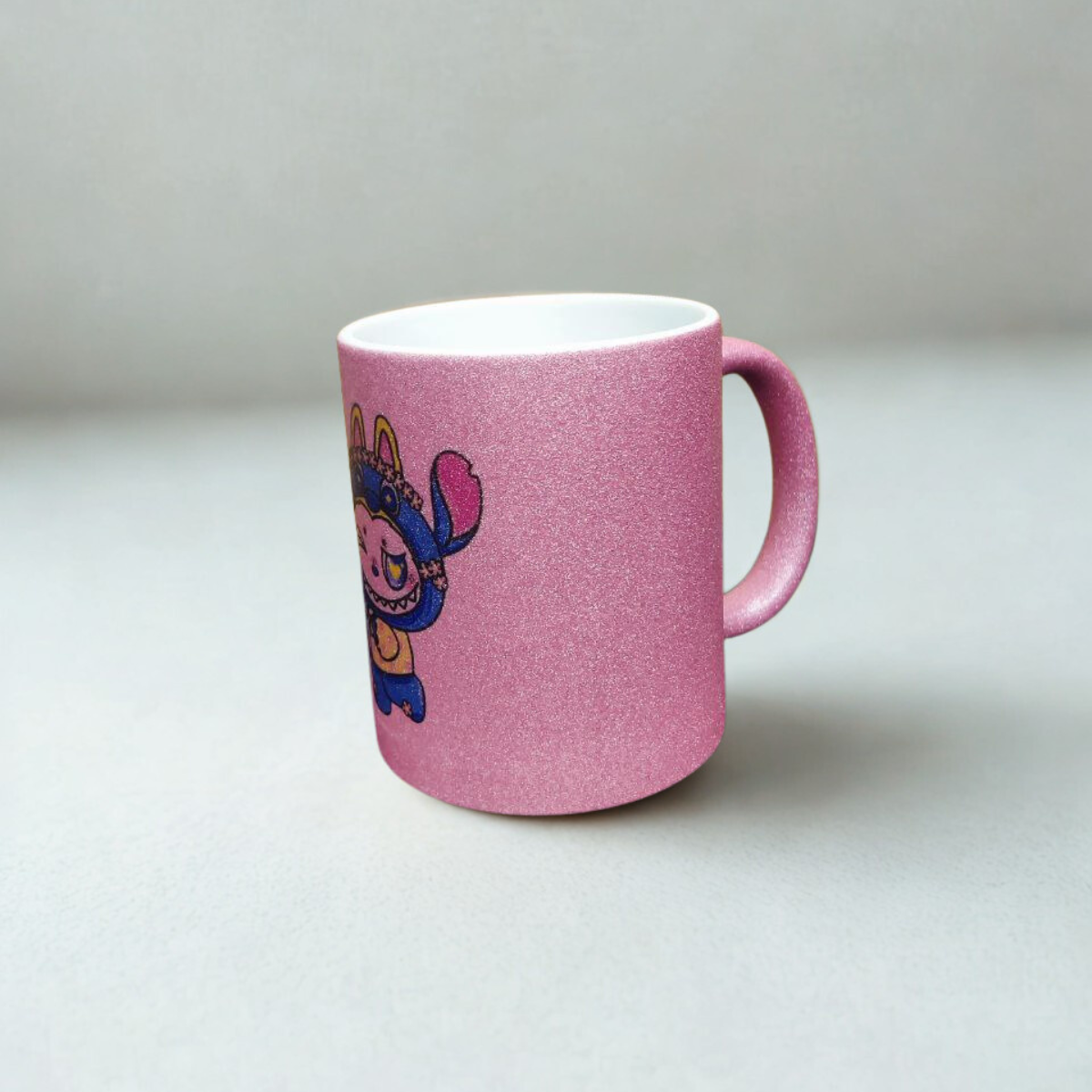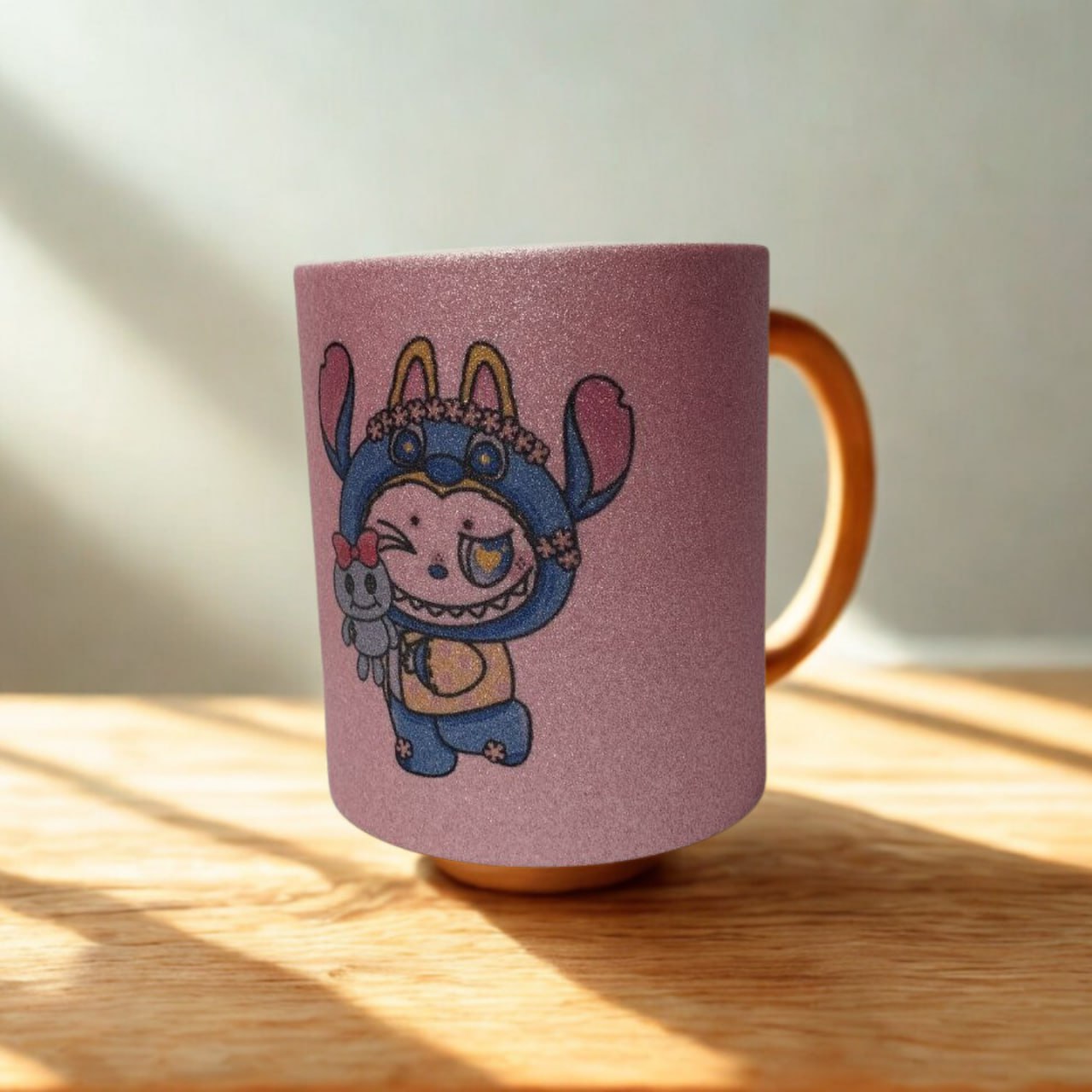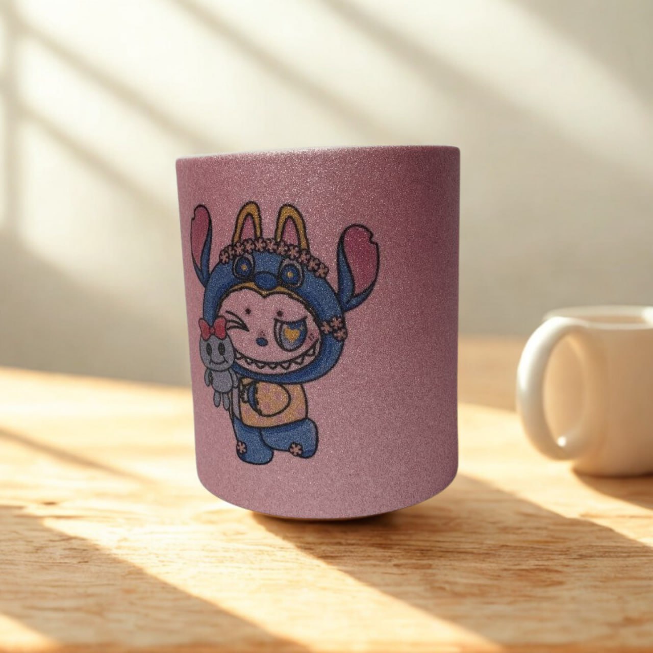 Добави вълшебство към всяка глътка с тази невероятна керамична чаша! В розов матов цвят, обсипан с блестящ брокат, тя комбинира стил и игриво настроение. На нея е изобразен чаровният Лабубу–Стич – комбинация, която носи усмивки и добро настроение още от сутринта.