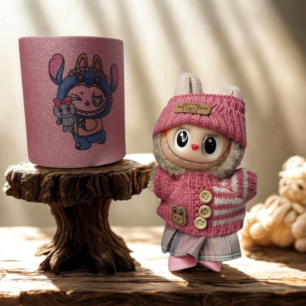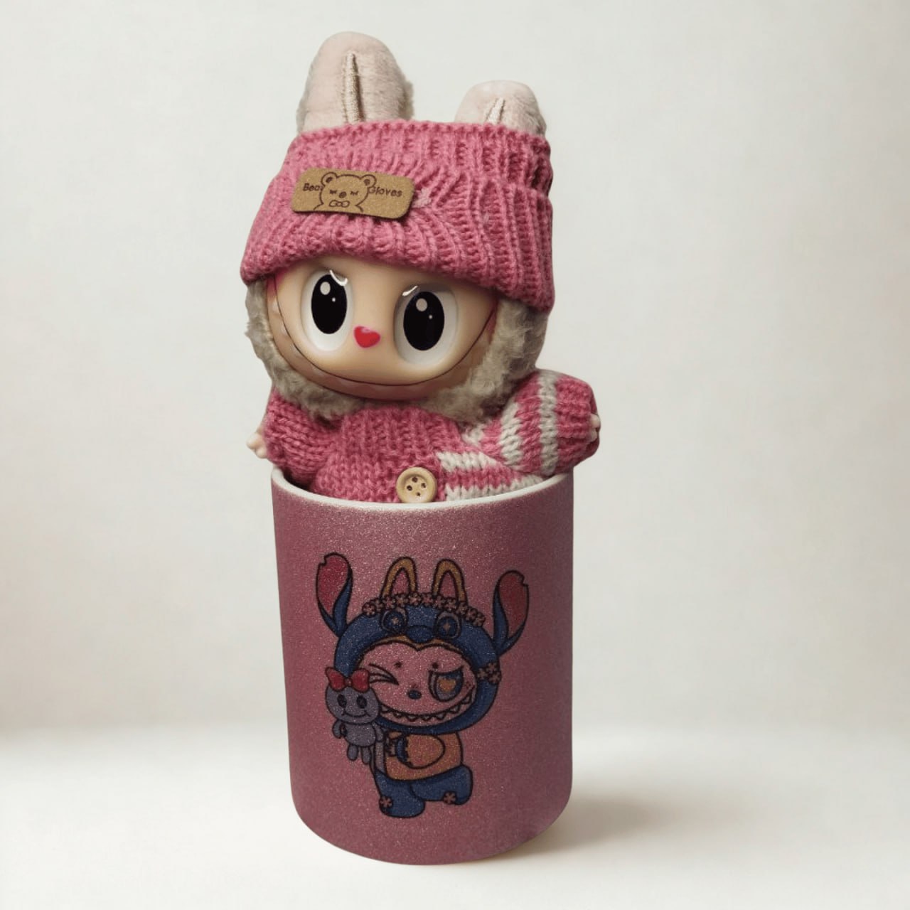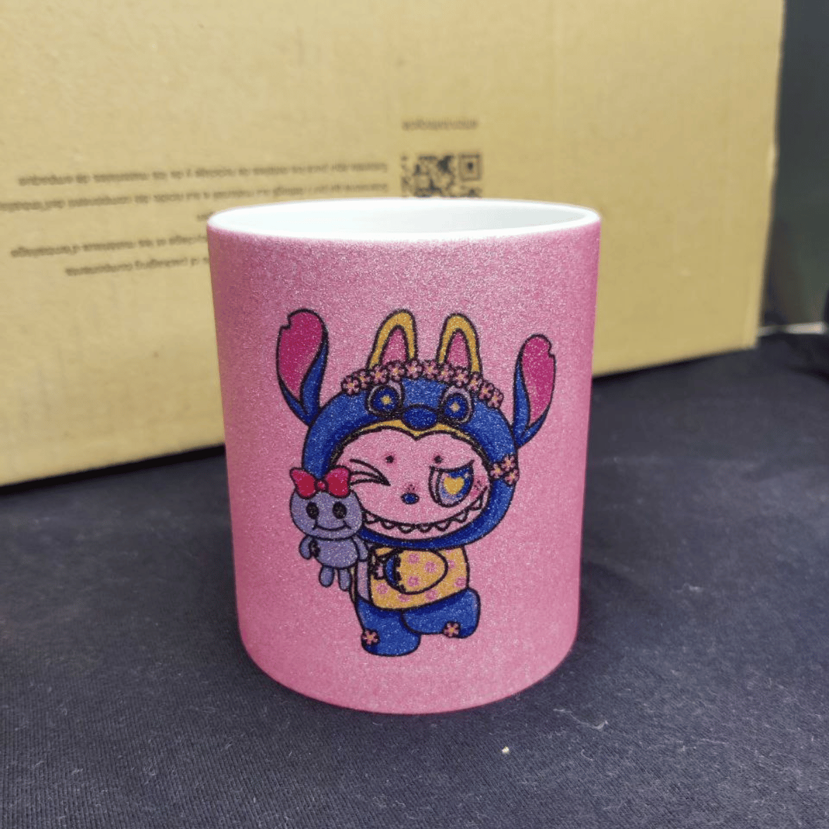 Добави вълшебство към всяка глътка с тази невероятна керамична чаша! В розов матов цвят, обсипан с блестящ брокат, тя комбинира стил и игриво настроение. На нея е изобразен чаровният Лабубу–Стич – комбинация, която носи усмивки и добро настроение още от сутринта.