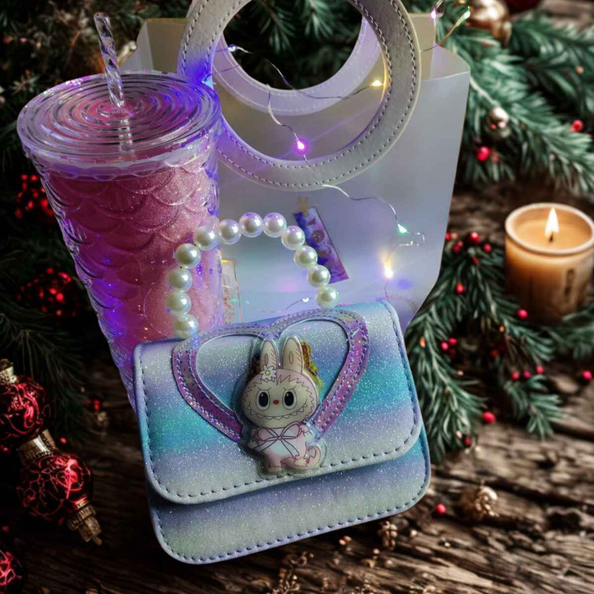 ✨ Бляскава чантичка Labubu с перлена дръжка