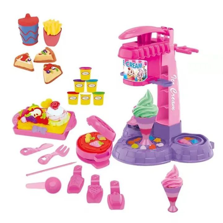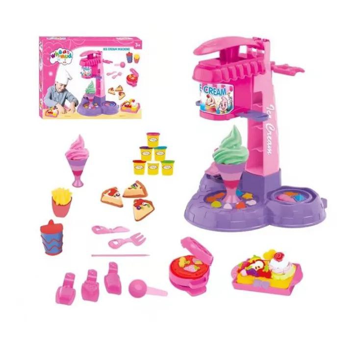 Превърнете детската стая в истинска сладоледена работилница! С този цветен комплект малките сладкари могат да „произвеждат“ мек сладолед, да оформят вафлени фунийки, да декорират тортички, пици и десерти с помощта на форми, преса за сладолед и пластилин в ярки цветове.