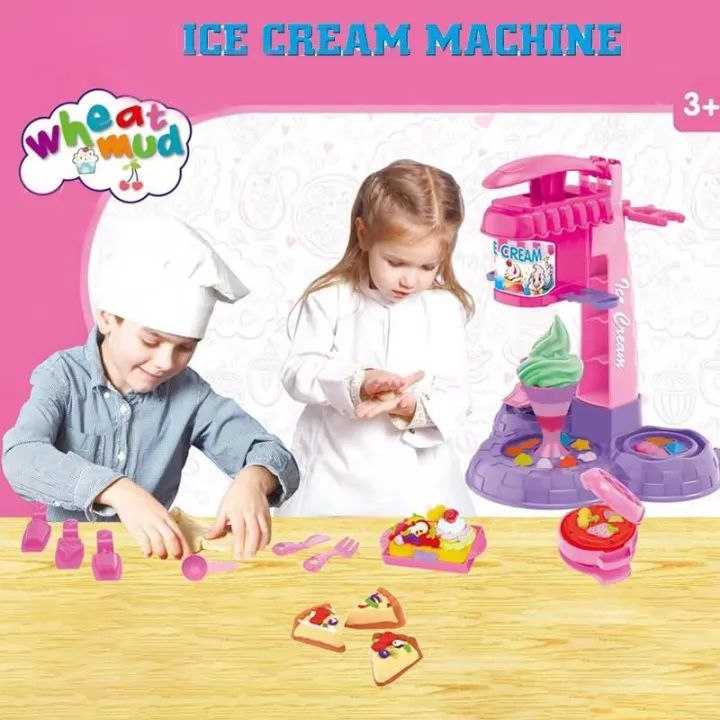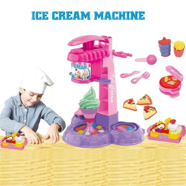 Комплектът съдържа всичко необходимо за креативна игра – от машината с ръчка, през формички за десерти, до прибори, купички и бурканчета с пластилин. Детето натиска лоста, пластилинът излиза като сладоледена спирала, а след това може да украсява с плодчета, топинг и фигурки. Игра, която стимулира въображението и ролевото обучение – “Аз съм сладоледен майстор!”.
